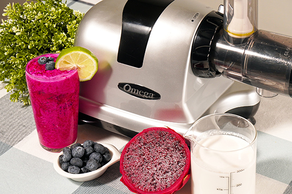 作法:將紅龍果去皮去籽切塊與藍莓進行冰凍,再使用Omega冷壓慢磨機的出料模式交錯投入研磨,將研磨完成的食材倒入杏仁奶拌勻即可。