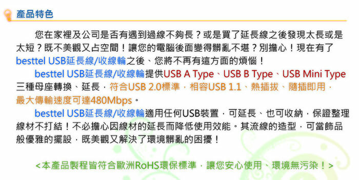 besttel USB延長線/收線輪提供USB A Type、USB B Type、USB Mini Type三種母座轉換、延長,符合USB 2.0標準,相容USB 1.1、熱插拔、隨插即用,最大傳輸速度可達480Mbps。