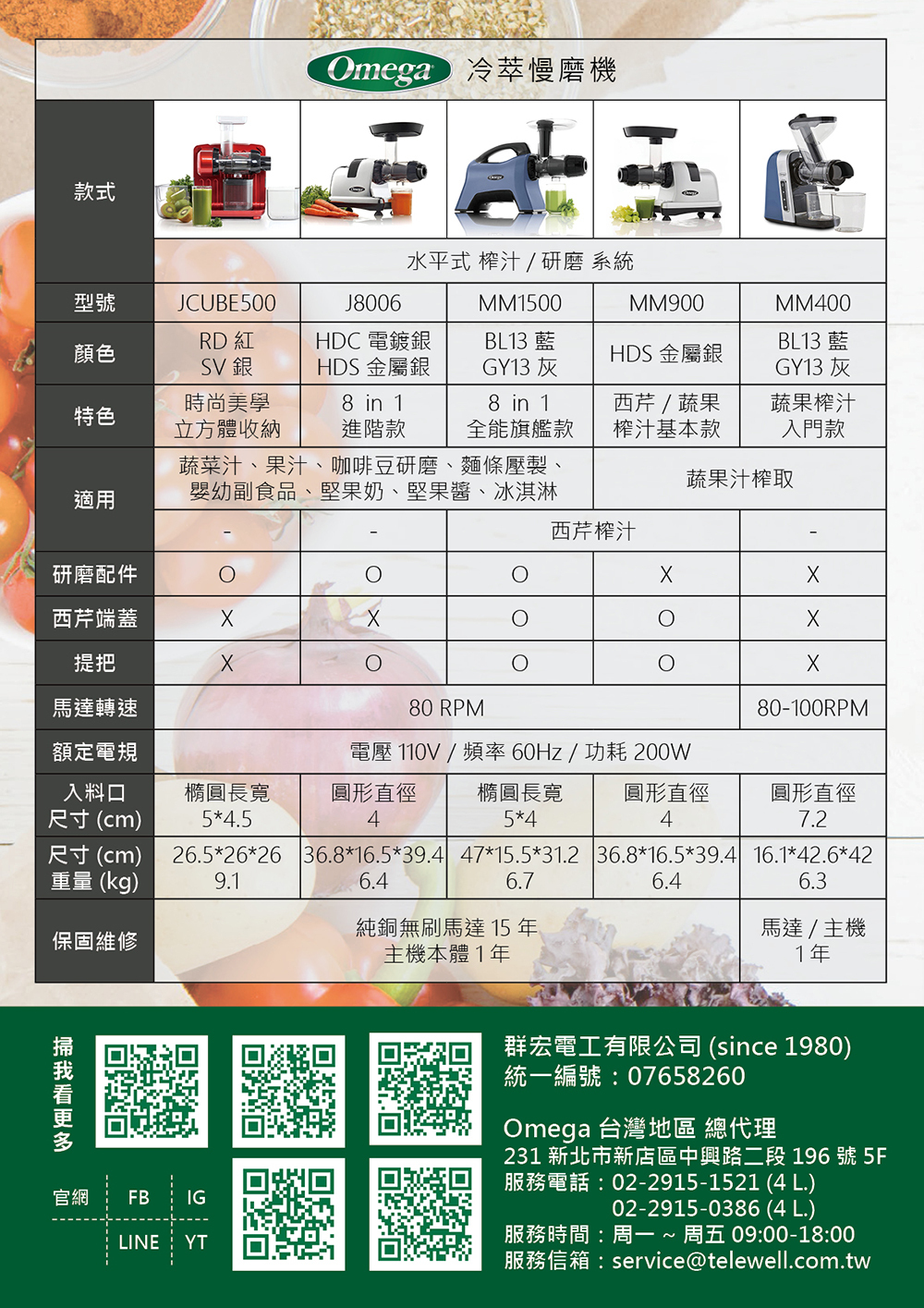 新型 Omega JCube500 榨汁機由 Omega 設計並獲得專利,其集結了熱銷型號(NC802、NC902)的所有優點,並添加了一些造型風格。對於遵循自然飲食建議、製作健康蔬果汁的人來說,Omega JCube500 的優異性能讓人滿意。