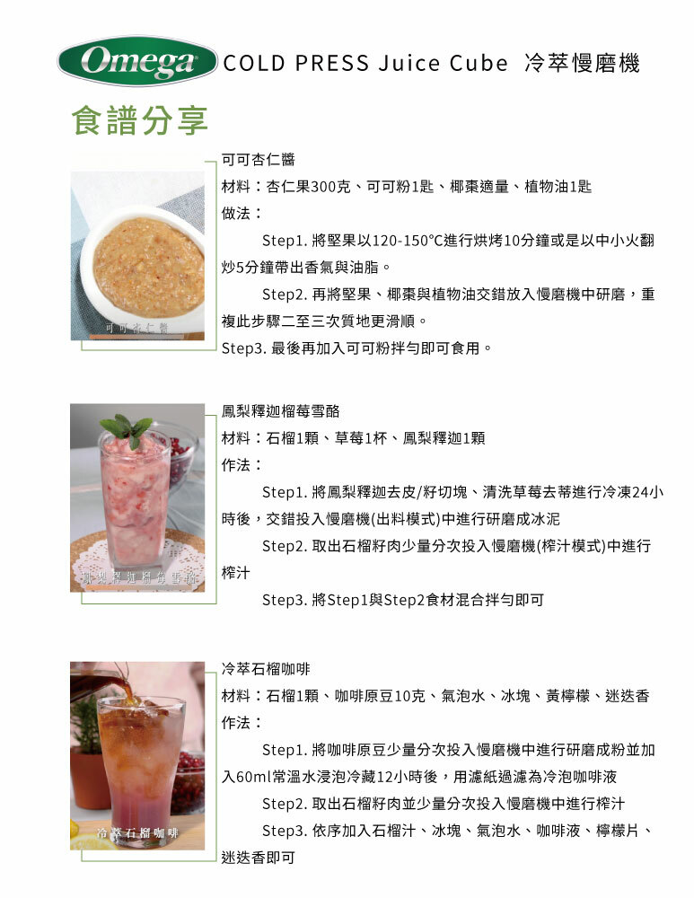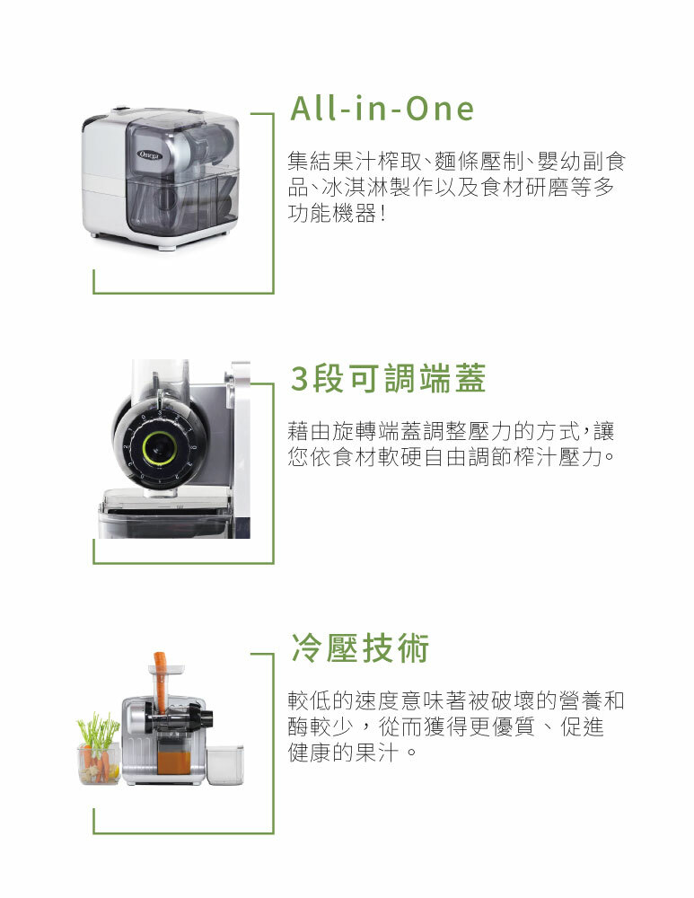 Omega JCube500 除了擁有榨汁機的所有優點外,您還可以使用原裝的6個附件,將您的機器變成全能營養中心。通過更換部件,您的榨汁機還能夠製作堅果醬、堅果奶、麵包棒、米粉、冰品甜點、醬汁、麵食、嬰兒食品等等。