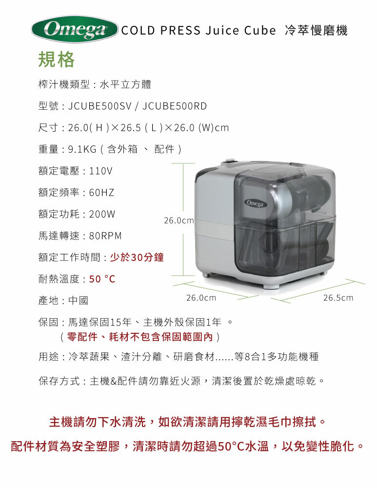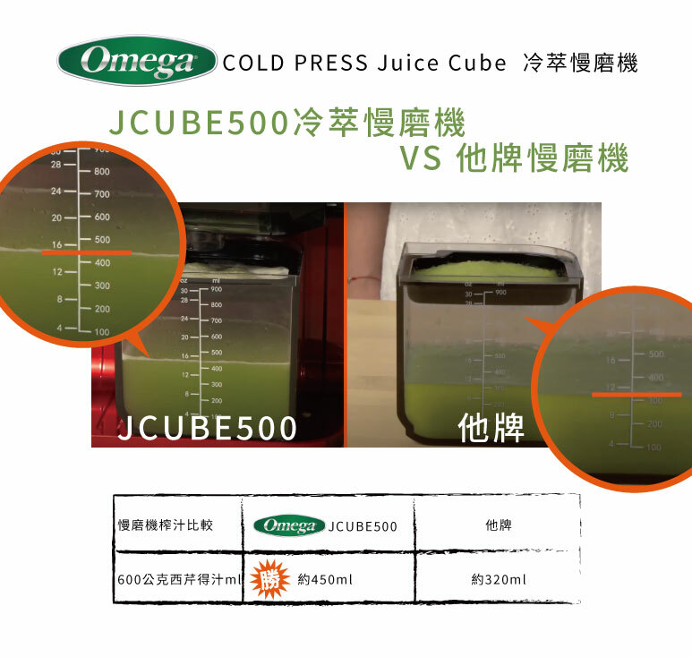 新型 Omega JCube500 榨汁機由 Omega 設計並獲得專利,其集結了熱銷型號(NC802、NC902)的所有優點,並添加了一些造型風格。對於遵循自然飲食建議、製作健康蔬果汁的人來說,Omega JCube500 的優異性能讓人滿意。