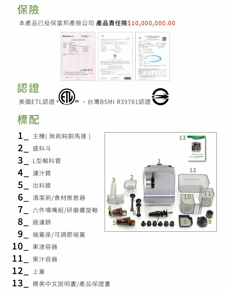 Omega 所有的榨汁配件均不含 BPA,研發團隊花費了數月的時間來進行測試,以確保其可承受投入的所有食材並提供經久耐用的高品質零件。
