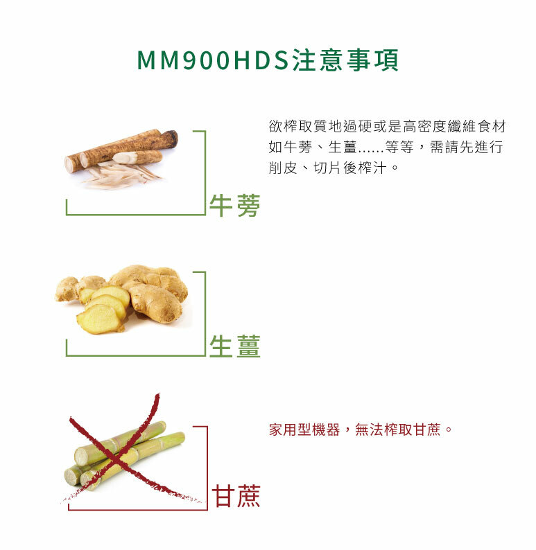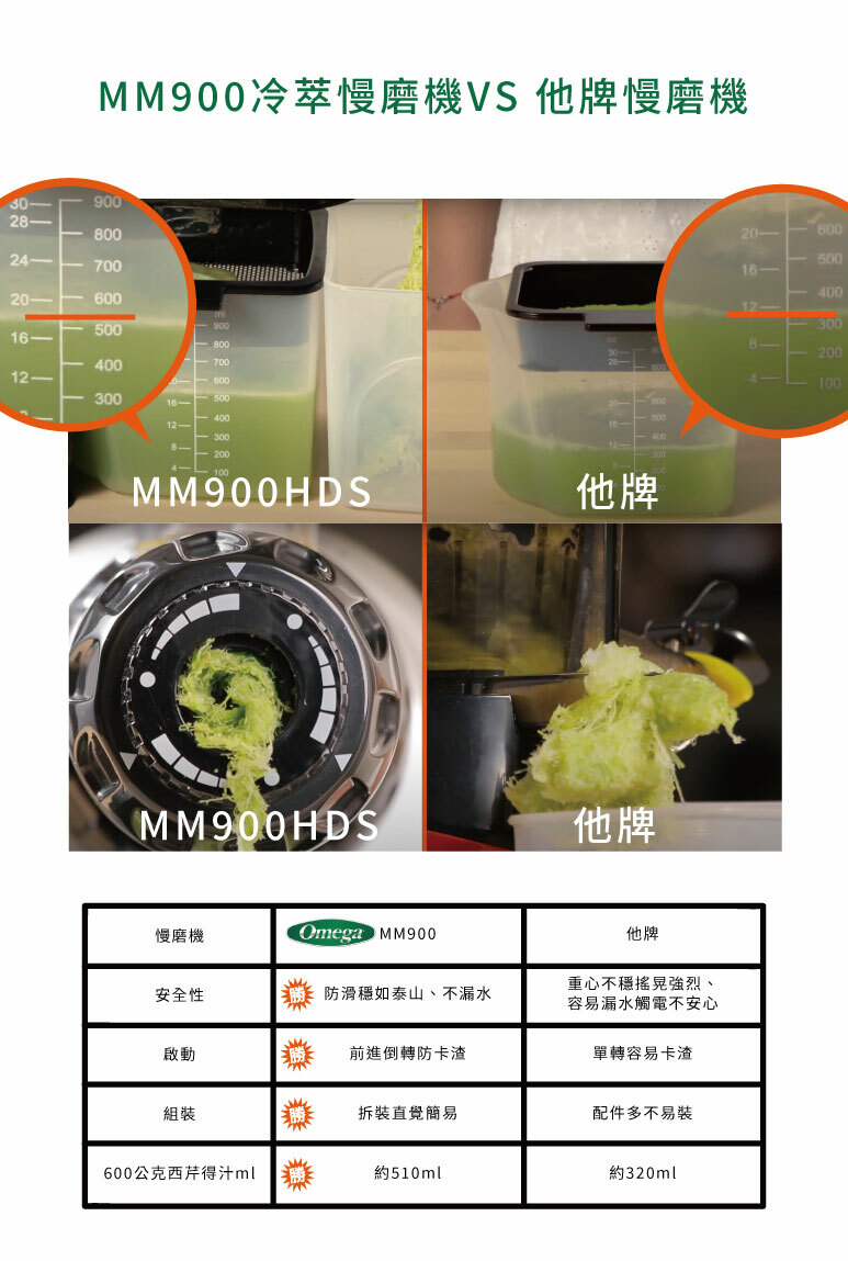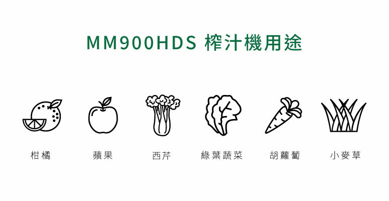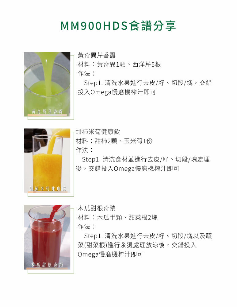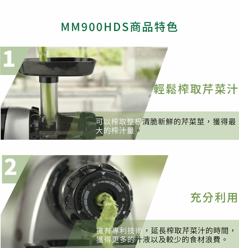 不需要再被機器噪音影響您的榨汁心情!由於轉速較慢,Omega MM900HDS 在運行時幾乎是無聲的,這意味著您不必擔心每次榨汁時會打擾到家人或鄰居。