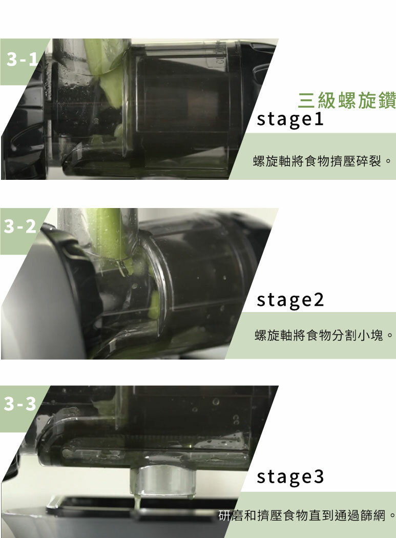 透過三級螺旋鑽的研磨,可自蔬果中獲得更多的維生素等營養成分及汁液。