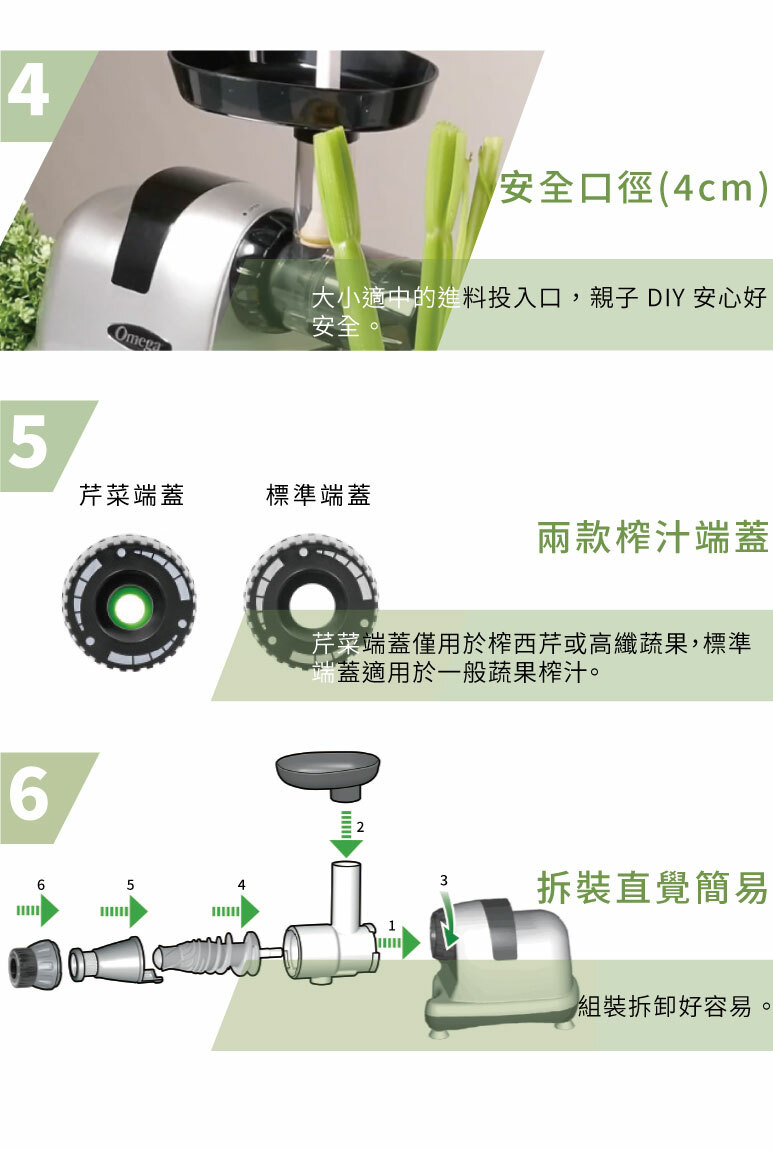 芹菜端蓋僅於西芹或高纖蔬果榨汁時使用,標準端蓋用於一般蔬果榨汁。